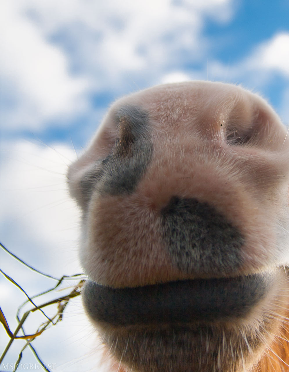 Svart häst som eg är vit i motljus. Tagen liggandes på mage i finja. Hästen undrade vad fn jag gjorde
