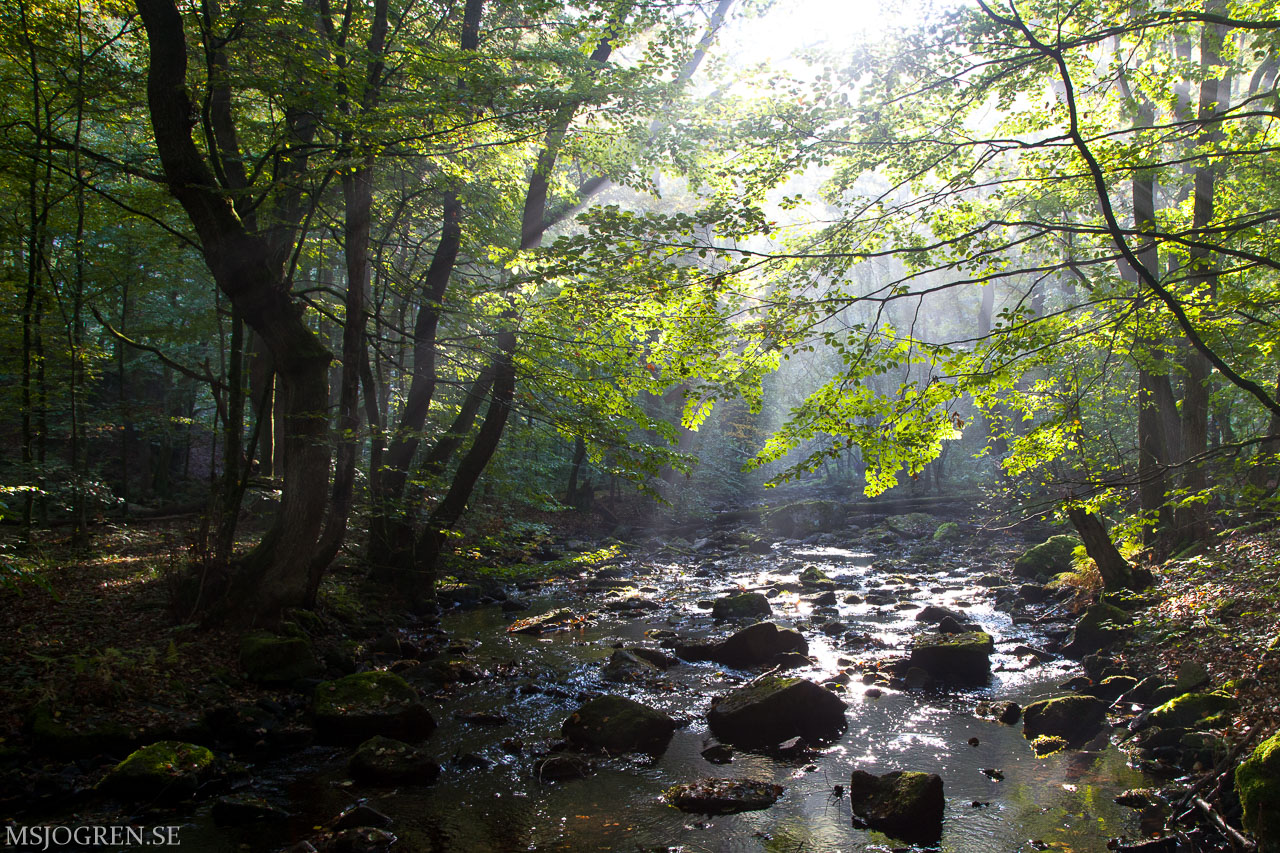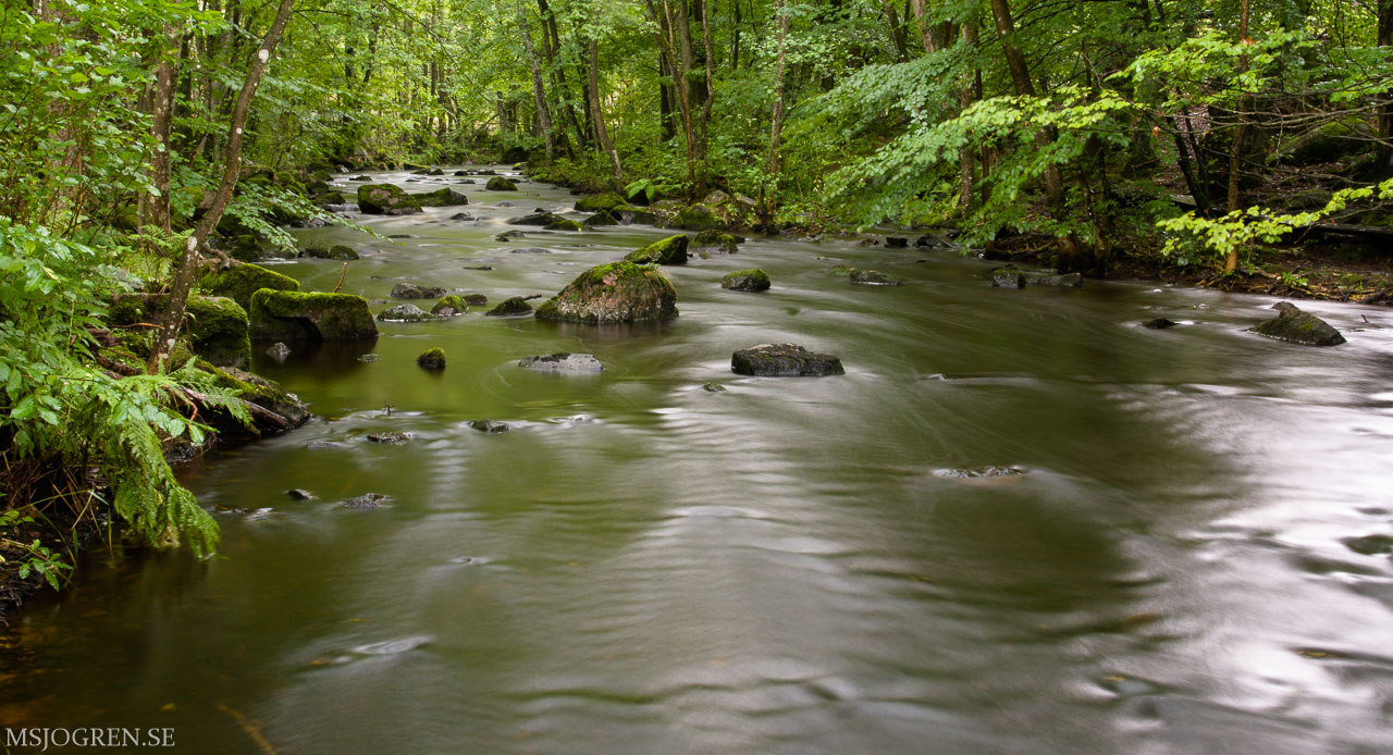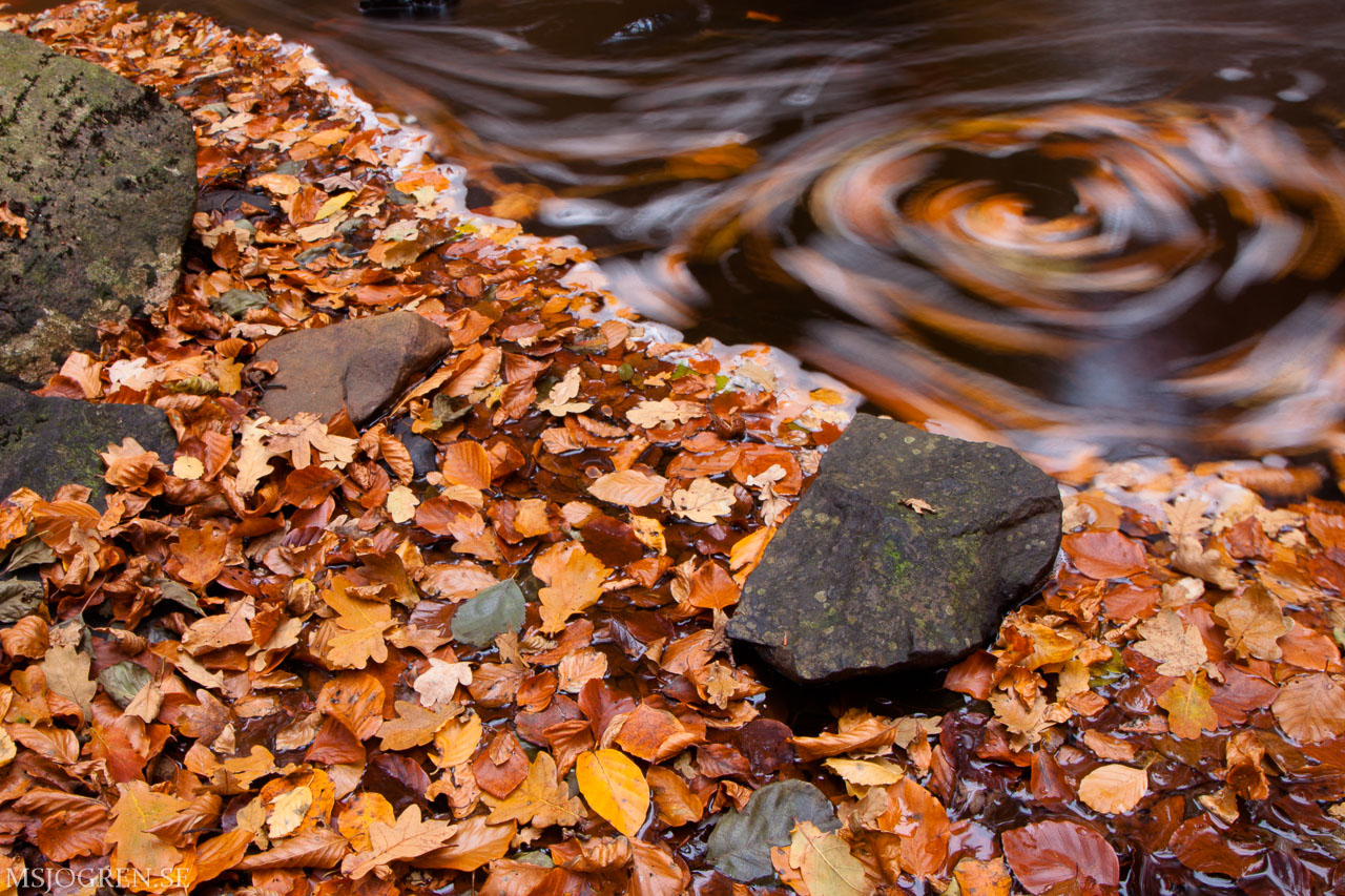 Bjersgård med lång slutare. Lövens snurr i bäcken ger en latjo effekt