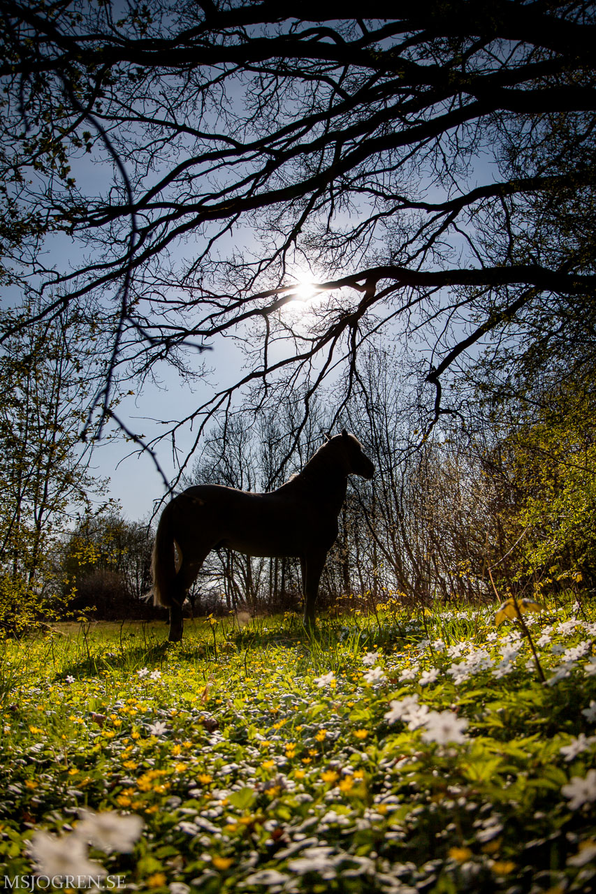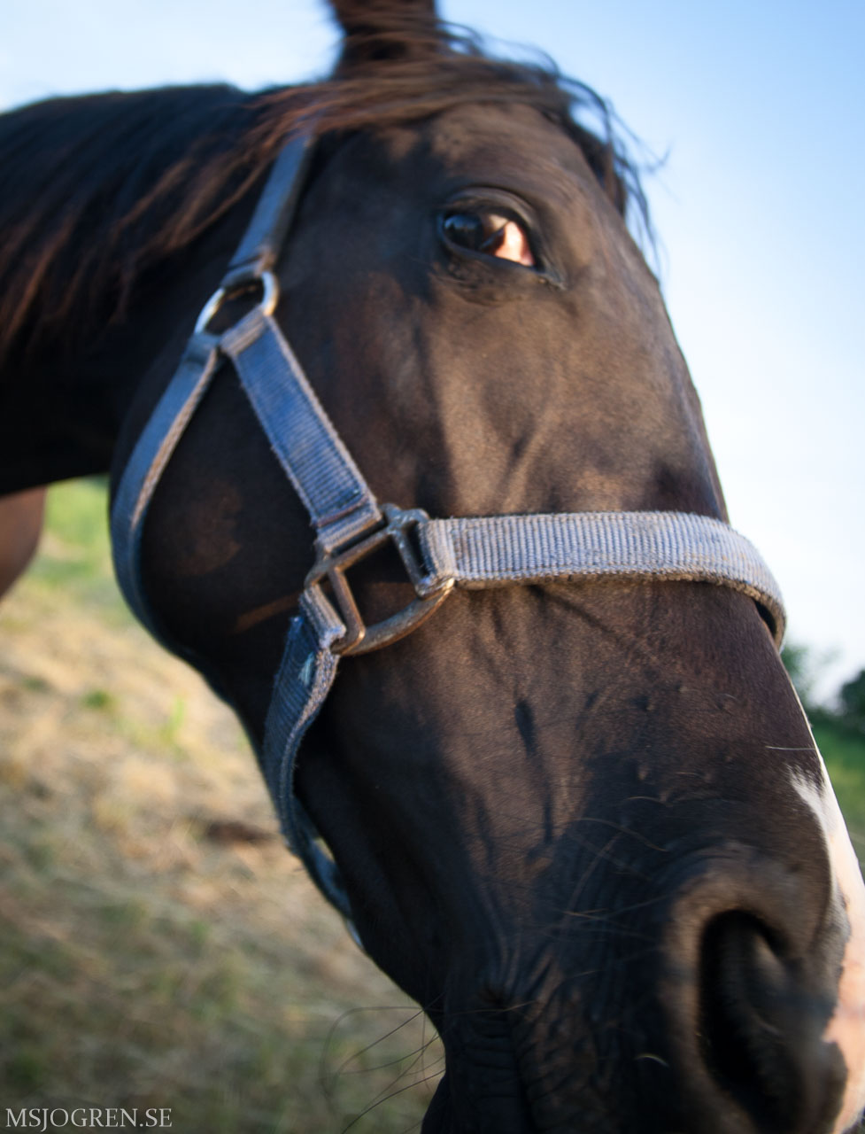 Svart häst som eg är vit i motljus. Tagen liggandes på mage i finja. Hästen undrade vad fn jag gjorde