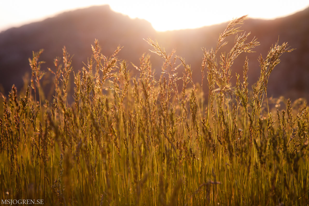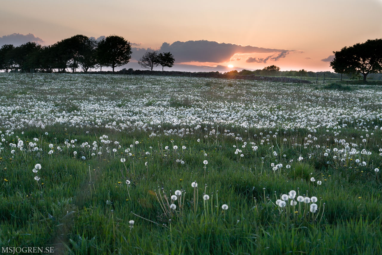 Kvällsol över äng med maskrosor