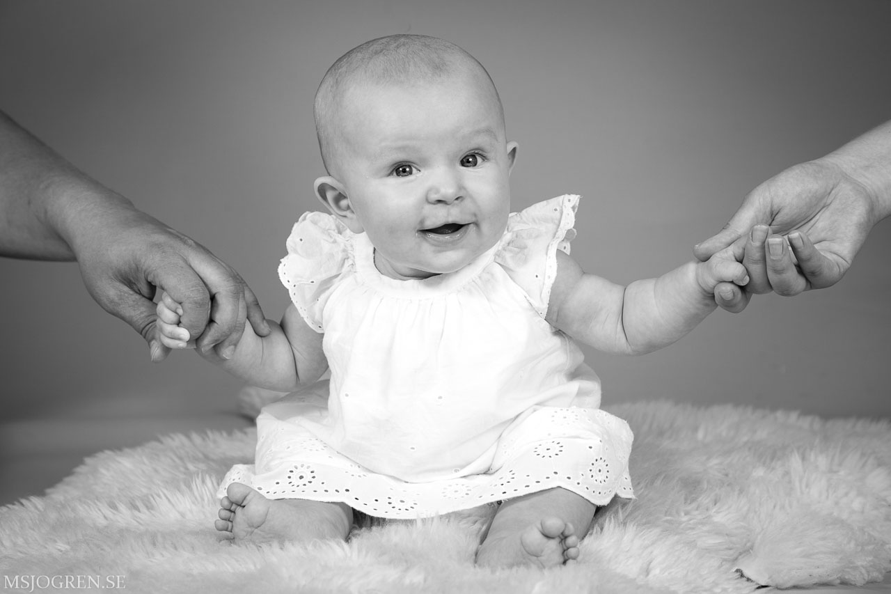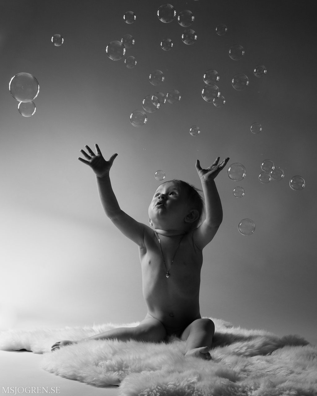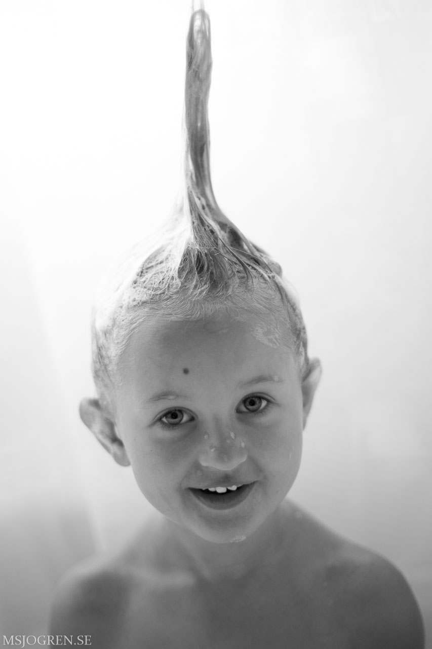 Tilda sträcker sig efter såpbubblor, som mamma febrilt blåser utanför bild. Hänger som canvas i hemmet